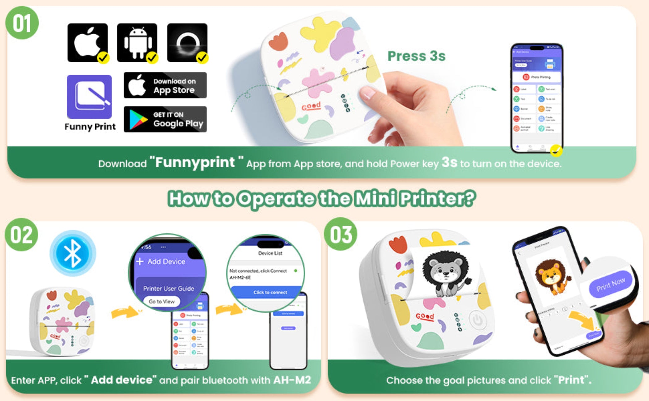 - Open the app first → power on the printer → you may need to connect manually, or a pairing prompt will appear.